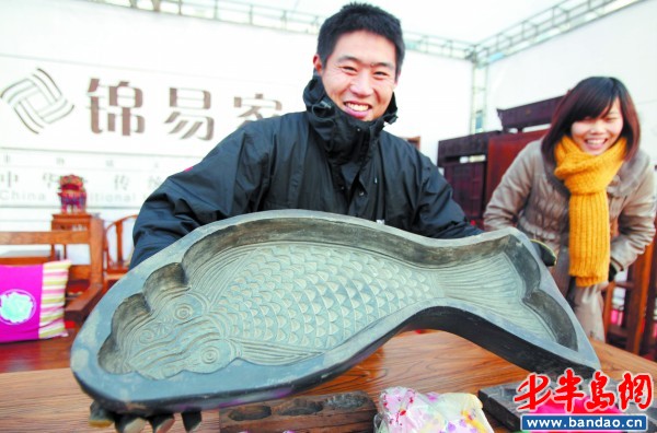 1月3日,臺(tái)東三路步行街上,一市民正在觀看一個(gè)重約20多斤的鯉魚卡花模具,由于個(gè)頭較大,吸引不少市民駐足觀看。據(jù)了解,這個(gè)模具是清朝年間的物件,石塊材質(zhì),當(dāng)時(shí)一般大戶人家在祭拜先祖時(shí)候所用,這次作為藝術(shù)展品對外公開展出。記者 何毅