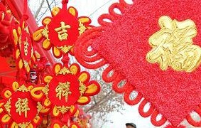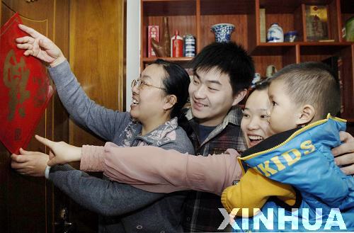 1月22日,在濟(jì)南市天橋區(qū)濱河星都小區(qū),石翠竹(右二)抱著福娃福志昊和家人一起貼“!弊。新華社記者 郭緒雷 攝