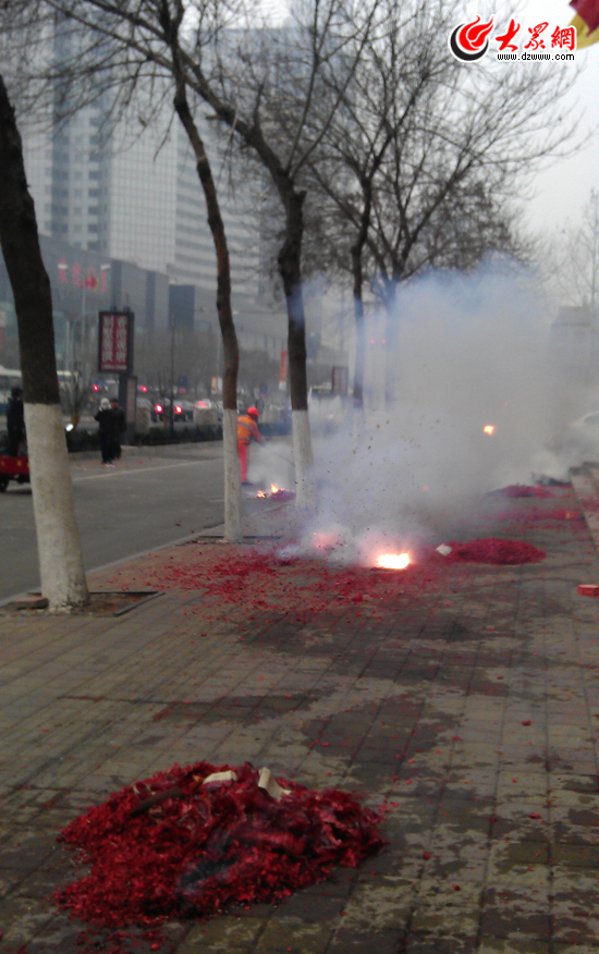 濟(jì)南初七“開(kāi)門(mén)炮”產(chǎn)生的濃煙不僅污染了空氣,許多鞭炮皮產(chǎn)生的明火還帶來(lái)了火災(zāi)隱患。