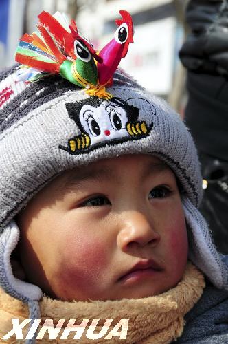 2月3日,在山東省臨沂市郯城縣馬頭鎮(zhèn)集市上,一名男孩頭戴“春雞”。