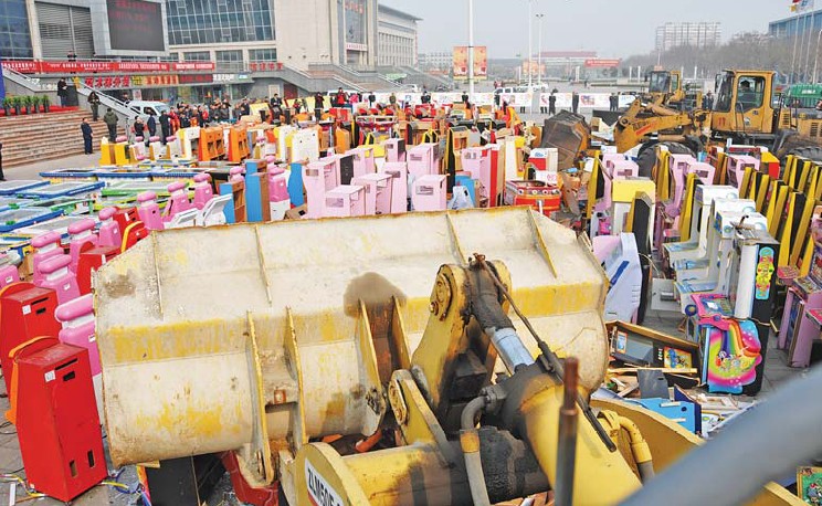 14日上午,濟寧市公安、文化、工商等多個部門聯(lián)動,在濟寧市全民健身廣場舉行集中銷毀賭博機現(xiàn)場會,580余臺賭博機被集中銷毀。自去年10月以來,濟寧市組織開展了打擊利用賭博機賭博違法犯罪專項行動,截至目前,共搗毀利用賭博機賭博窩點90余個,取締場所40余家,收繳賭博機1500余臺! 齊魯晚報記者 姬生輝 李巖松 攝影報道