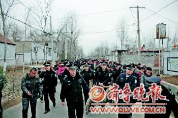 民警抬著被擊斃的咬人狼走在村路上,引來大批村民圍觀! ”緢(bào)通訊員 馮青 秦存超 攝
