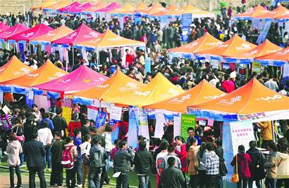 昨天,“山東半島藍色經濟區(qū)”和“黃河三角洲高效生態(tài)經濟區(qū)”暨山東省民營企業(yè)財經人才專場招聘會在山東財經大學燕山校區(qū)舉行,吸引近萬名大學畢業(yè)生參加。 (記者 崔健 攝)