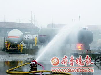 ▲10日,事發(fā)物流企業(yè)隔壁液化氣站的50噸液化氣罐仍有明火,消防員正在滅火。 本報記者 趙波 攝