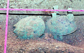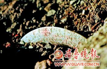 18日,沂水天上王城崮頂春秋大墓考古正在進行中,考古人員清理了棺槨部分。下午4時許,一段環(huán)狀的玉器露出土面,呈現(xiàn)出類似油脂的光澤,細看表面有清晰的雙鉤線紋飾。專家稱,應(yīng)為玉環(huán)或者玉璧。據(jù)介紹,春秋時期,奉行周禮的各國對于玉器的使用十分嚴格。玉器是象征墓主人生前等級身份的物件! ”緢笥浾摺堉小z