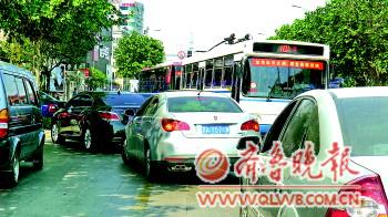 5月4日上午,泉城路中段,大量等候進(jìn)入恒隆免費(fèi)停車場(chǎng)的汽車擋住了公交車專用道,101路電車被阻。