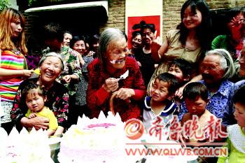 5月8日,聊城市陽谷縣大布鄉(xiāng)王莊村的王景之老人(手持蛋糕者)在家過112歲大壽,70余家族成員到場祝壽。老人如今七世同堂,四個女兒最大的86歲,最小的71歲,身體都很健康。王景之老人除了有點耳背,平時還能做飯、打掃院子。家人說,老人喜歡串門聊天,這么多年從來沒跟誰生過氣。據介紹,她也是現(xiàn)在聊城最長壽的老人! ”緢笥浾摺±钴姟z