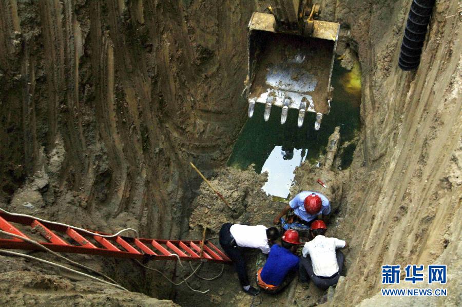 5月25日,工作人員在搶修被挖斷的輸油管道。