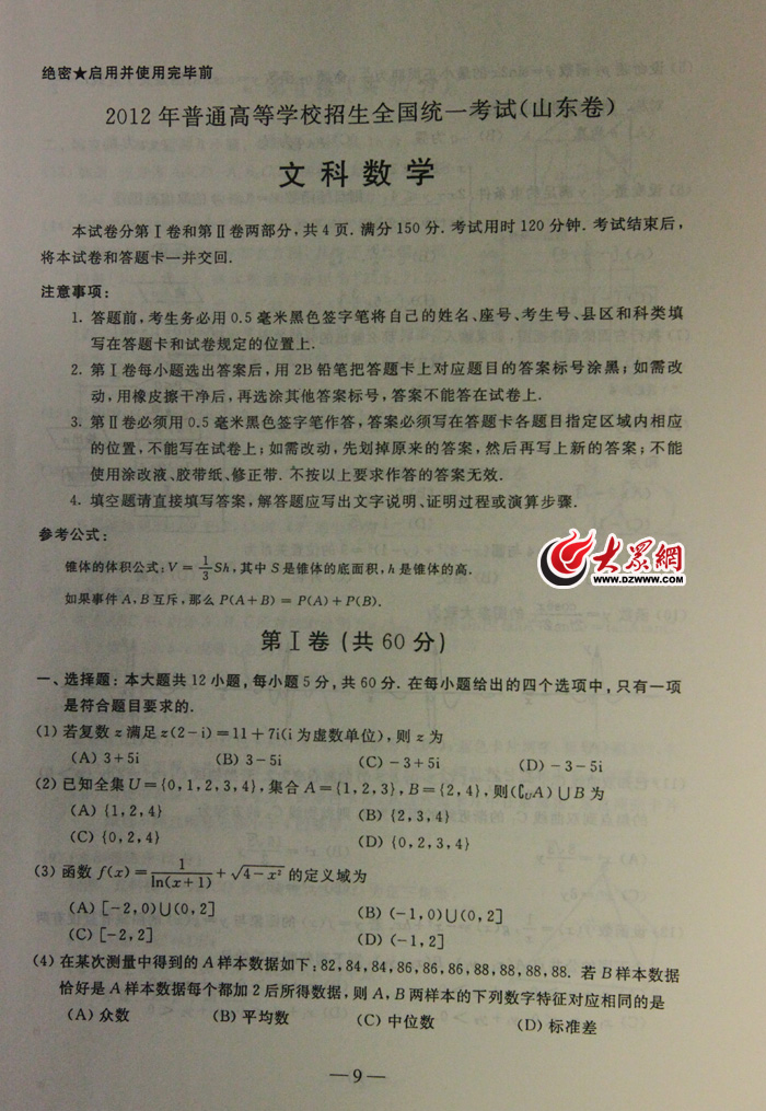 2012年山東高考文科數(shù)學(xué)試題及參考答案