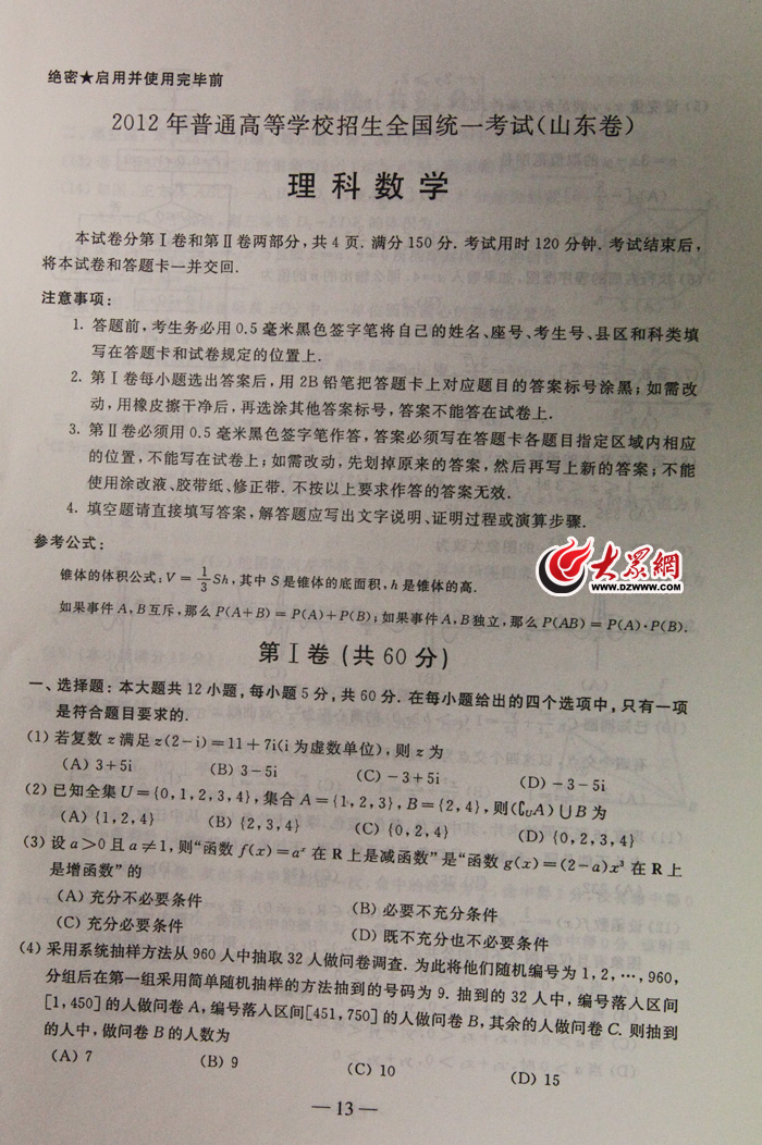 2012年山東高考理科數(shù)學(xué)試題及參考答案