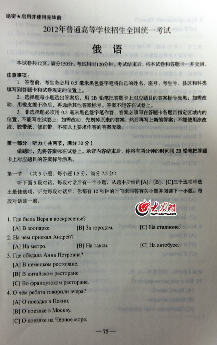 2012年山東高考俄語試題及參考答案