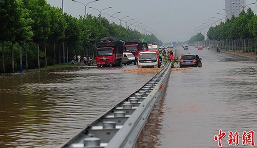 6月21日傍晚,濟(jì)南東部郊區(qū)突降暴雨,一時(shí)間馬路成河,交通阻斷,不少車輛被淹。水位下降后,大車才緩慢通過。近日濟(jì)南干旱少雨,這場大雨對于緩解旱情十分有利。圖為21日傍晚,濟(jì)南東部郊區(qū)突降暴雨,一時(shí)間馬路成河,交通阻斷。