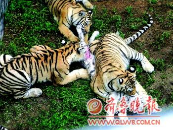 本報威海7月10日訊(記者 王帥) 三只老虎活生生把另外一只老虎咬死,并啃食其尸體。近日有網(wǎng)友爆料稱,在威海榮成西霞口景區(qū)神雕山野生動物園游玩時,見證了這樣一幕。10日,西霞口景區(qū)回應(yīng)稱老虎打架事件確有發(fā)生,原因還在調(diào)查中。 9日晚上,網(wǎng)友“庶民”發(fā)帖稱,9日早上7點多,在逛西霞口神雕山野生動物園時,看到了血淋淋的一幕:三只老虎摁著一只口鼻出血、顯然已經(jīng)死亡的幼虎撕咬。從這名網(wǎng)友發(fā)布的照片看,被撕咬老虎四肢朝天躺在地上,一只老虎死死咬住它的咽喉,另外兩只老虎撕咬其大腿,場面相當(dāng)血腥。 10日,神雕山野生動物園經(jīng)理田潤杰向本報記者證實,老虎打架事件發(fā)生在“和諧樂園”,工作人員發(fā)現(xiàn)打架事件后,用了十分鐘左右的時間將三只襲擊同伴的老虎驅(qū)趕開,并緊急將受傷白虎送治,但經(jīng)過搶救無效后死亡。 田潤杰介紹,死亡的老虎是一只白虎,才十個月大;其他三只是孟加拉虎,也都剛滿一歲。每天下午6點,工作人員為老虎喂食,食物以牛肉、雞蛋、維生素為主,一歲左右的老虎一頓進(jìn)食約四斤牛肉。他認(rèn)為,老虎食物的供應(yīng)量每天都有嚴(yán)格的規(guī)定,基本能夠滿足它們的需求,網(wǎng)友說的因饑餓打架的可能性是不成立的! 田潤杰表示,西霞口景區(qū)非常重視此次事件,正在組織有關(guān)專家分析原因,一有結(jié)果便會向社會公布!(請照片作者與本報聯(lián)系領(lǐng)取稿酬)