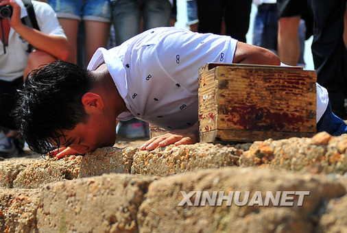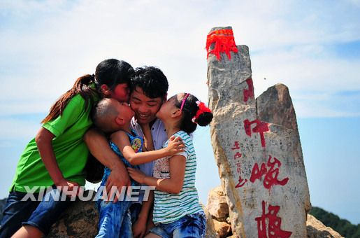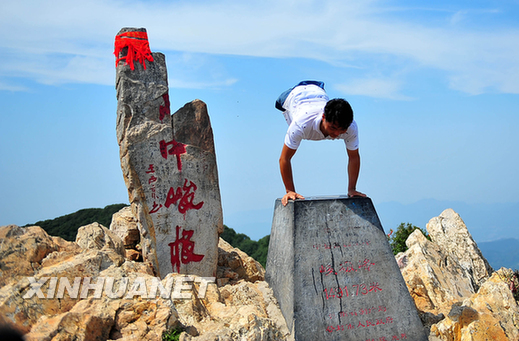 7月12日,陳州在嵩山峻極峰頂親吻地面,慶祝成功登頂。新華社記者朱崢攝