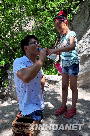 7月12日,9歲的女兒在給陳州喂水,鼓勵父親向頂峰沖擊。新華社記者朱崢攝