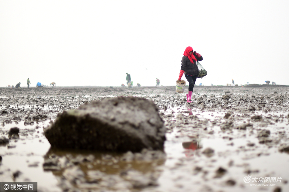 2017年01月01日,山東省青島市。在山東青島膠州灣北部的紅島宿流社區(qū),有一片數(shù)百畝的海灘,這里因盛產(chǎn)野生海蠣子(牡蠣)而出名,這片海灘叫黃瀾海灘。隆冬時節(jié),正是海蠣子收獲的旺季。今年,青島野生海蠣子大豐收,產(chǎn)量比往年增加兩到三成,這片海灘每天都吸引眾多挖蠣人前來趕海、采鮮。一位經(jīng)常在此挖海蠣子的女工告訴記者,近幾天落潮時分,她一小時就能挖100斤左右,最多一天可以挖200多斤海蠣子。