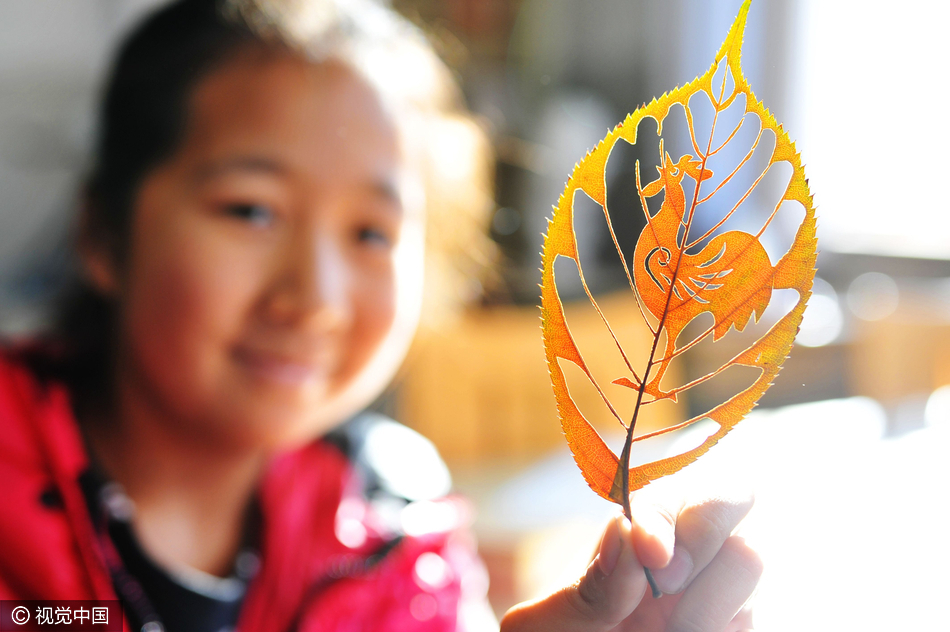 2017年1月11日,山東省青島市,近期,一組用樹葉創(chuàng)作的生肖雞迎新年作品刷爆朋友圈,展示出精美的樹葉上的剪紙藝術(shù)。據(jù)了解,身為小學(xué)美術(shù)教師的王萍酷愛葉雕藝術(shù),數(shù)年下來創(chuàng)作了很多作品。她利用工作之余搜集各種樹葉,并沿用傳統(tǒng)剪紙的表現(xiàn)形式,創(chuàng)作出許多精美的葉雕作品。