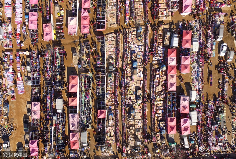 2017年1月15日,航拍器拍攝的山東省日照市東港區(qū)南湖鎮(zhèn)年貨大集。隨著農(nóng)歷雞年春節(jié)的臨近,人們開始忙著選購山珍海味、水果、煙酒等年貨,迎接新春佳節(jié)的到來。