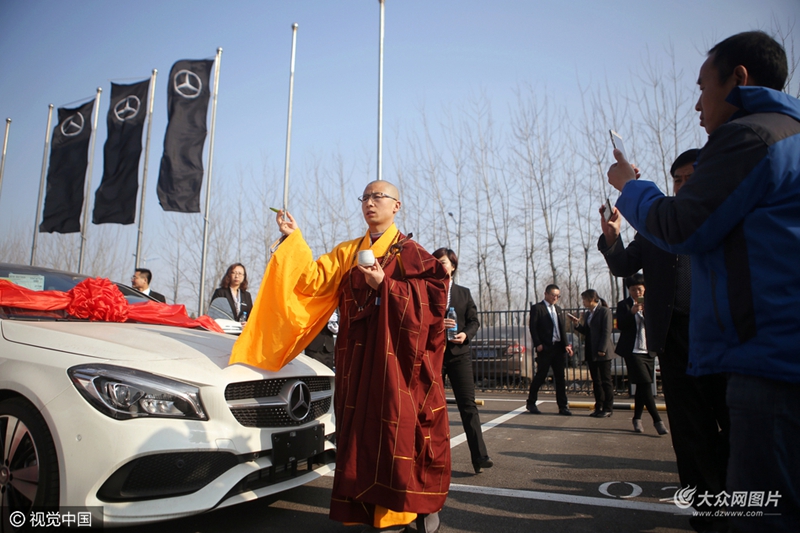 2017年1月15日,山東省濱州市,一家知名豪車品牌4S店請高僧為車主預(yù)訂的十多臺新車舉行了盛大的開光祈福儀式,場面十分壯觀,車主紛紛用手機(jī)拍攝視頻記錄下這一隆重的場面。