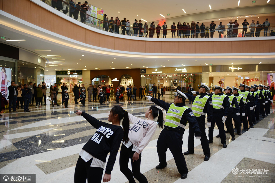 2017年01月17日,山東省日照市,日照交警直屬大隊組織民警通過快閃這種新穎的形式,創(chuàng)新交通安全宣傳的形式,提高群眾群眾的交通安全意識,宣傳交通安全與文明。圖片作者:劉濤/視覺中國