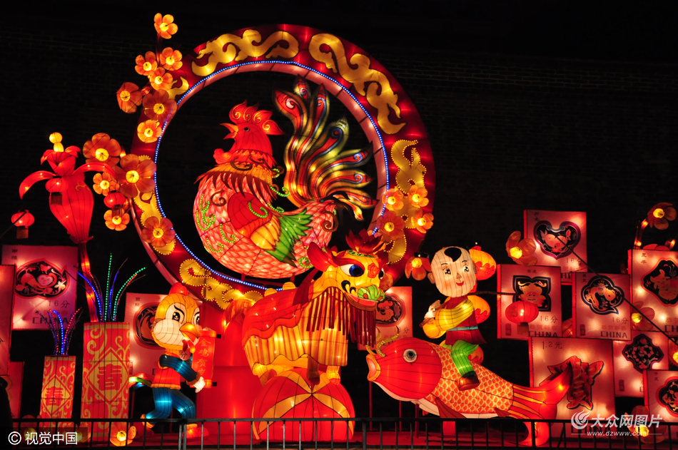 2017年1月21日,在山東聊城中華水上古城內(nèi),各式各樣的花燈彩燈交相輝映,美輪美奐,給景區(qū)增添了濃濃的年味。2017山東聊城燈會(huì)從1月20日至2月14日,金雞報(bào)春、恭賀新禧、百鳥(niǎo)朝鳳、新年送福等30余組燈,更有同心鎖、狀元迎親等特色參與性燈組亮相古城,喜迎新春。