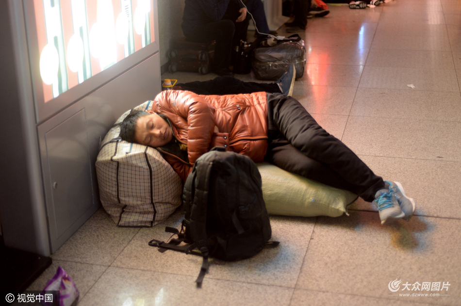 2017年1月21日,濟(jì)南,深夜時(shí)分火車站候車大廳依然熱鬧得如同“不夜城”,等車的人們或躺或坐、或相依相偎、或相擁而眠,在即將回家的時(shí)候,夢(mèng)回故鄉(xiāng)。也有三五成群的農(nóng)民工怕攜帶的行李多弄臟候車的乘客,席地而坐,躺臥在行李上。圖片作者:御寧/視覺(jué)中國(guó)