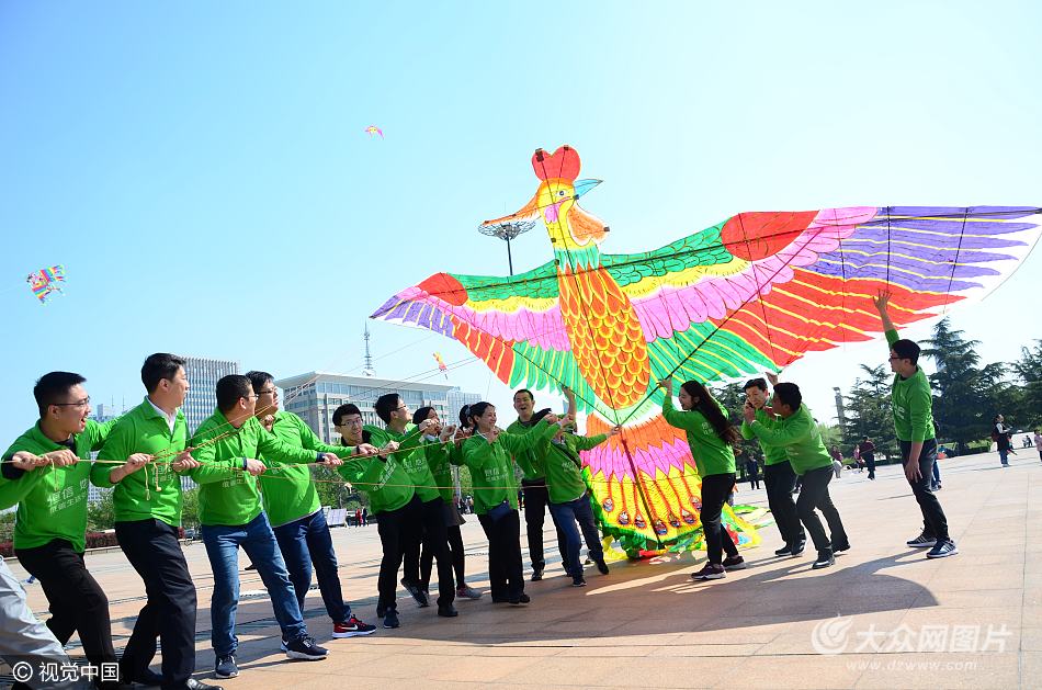 2017年4月22日,山東濰坊市人民廣場(chǎng)上舉行風(fēng)箏放飛活動(dòng),一只60余米長(zhǎng)的巨龍風(fēng)箏和鳳凰風(fēng)箏格外惹注目,20余名市民齊心協(xié)力將其放飛。
