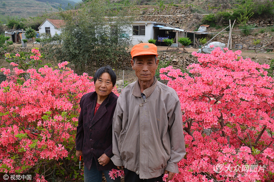2017年4月25日,山東日照。今年63歲的李吉祥和67歲的許傳美,是山東省日照市九仙山風(fēng)景區(qū)內(nèi),位于大山深處的宣王溝村人。從1998年開始,夫妻兩人在離村子?xùn)|南2里多的自家口糧地,以及山澗地頭上,栽種培育了近百畝杜鵑花和金銀花,花開時節(jié),杜鵑花和金銀花競相綻放,花香四溢,蜂蝶飛舞,使昔日的荒山變成現(xiàn)在的“私家花園”,成為九仙山景區(qū)內(nèi)一道亮麗的景觀。