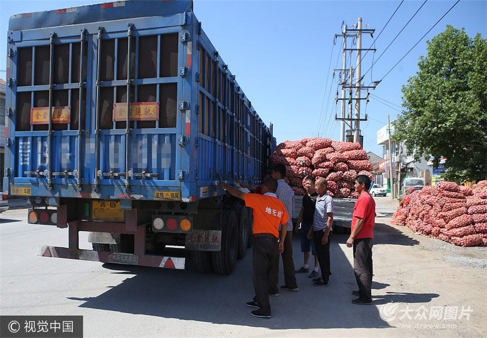 2017年5月25日,山東省濟(jì)南市,大蒜產(chǎn)地濟(jì)陽縣曲堤鎮(zhèn)進(jìn)入鮮蒜采收高峰期,外地來收蒜的車輛明顯增多,鮮蒜收購價(jià)較幾天前略有上漲。圖片作者:高立萌/視覺中國