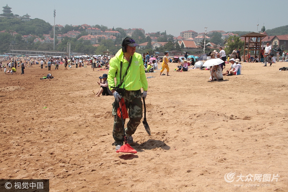 隨著浴場正式開放時間6月1日的臨近,青島第一海水浴場的游客逐漸增多,被釘子等金屬扎傷的游客也越來越多。為避免更多的游客被扎,一些沙灘“淘金者”便又開始行動了,他們頭戴耳機,右手持金屬探測儀,左手持鐵鍬,神情專注地掃描著沙灘上的每一片區(qū)域,甚至一天能探測出10斤硬幣和釘子,他們在“尋寶”的過程中,還承擔(dān)起了沙灘清道夫的角色,將掩埋在沙灘里的釘子等金屬清理出來。