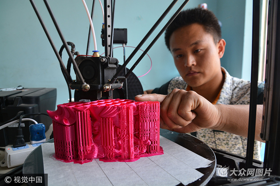 2017年5月31日,山東省日照市莒縣浮來山鎮(zhèn)二十里村,張志龍在檢查3D打印機工作情況。