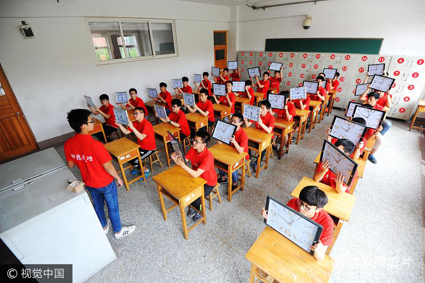 6月4日,青島平度一中的工作人員將所有的考場(chǎng)的時(shí)鐘全部校準(zhǔn)。