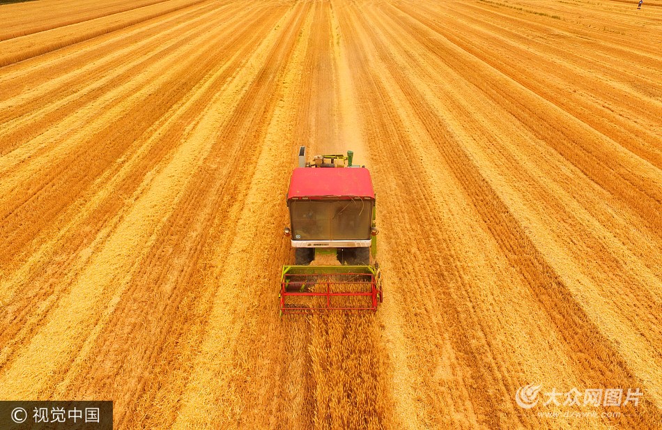 2017年6月5日,濟(jì)南市區(qū)陰云密布。黃河濟(jì)南段北岸一望無(wú)際的千頃麥田已經(jīng)成熟,當(dāng)?shù)卮迕窦娂娳s來(lái)請(qǐng)收割機(jī)搶收小麥,趕在下雨之前收獲。由于使用了秸稈粉碎收割機(jī),因此秸稈直接還田。