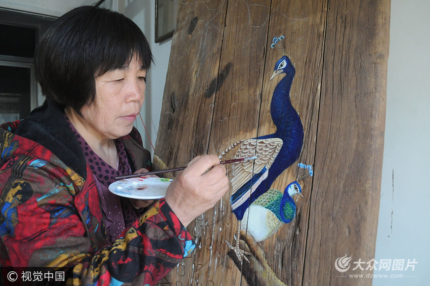 55歲的鄉(xiāng)村女畫(huà)家李玉蓮正在舊門(mén)板上創(chuàng)作
