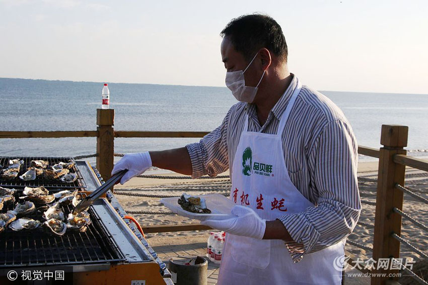 10月12日,在文登海邊,一名廚師正在烹飪生蠔。旅游旺季,海邊游客眾多,在這里一只手掌大小的生蠔能夠賣到50元,小一點(diǎn)的30到40元不等,主營(yíng)烤生蠔的一個(gè)小攤位,每日收入超過(guò)萬(wàn)元。