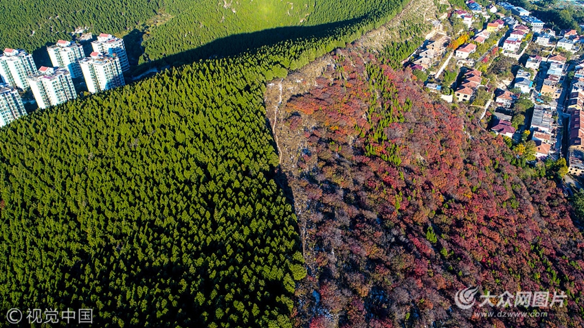 2017年10月30日,山東省濟(jì)南市,在舜世路南首的蝎子山南面山體,種植著數(shù)千棵黃櫨樹,在深秋低溫下樹葉由綠變紅,漫山遍野紅燦燦,形成2萬(wàn)多平方米的紅葉林,是市區(qū)二環(huán)以內(nèi)面積最大紅葉林。