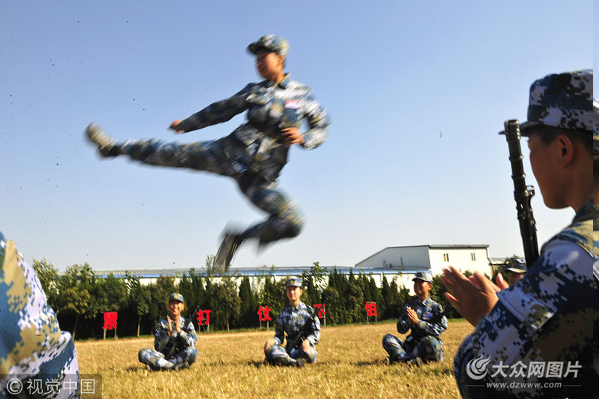 大學(xué)生女兵王思孌帶頭向戰(zhàn)友們展示基本功訓(xùn)練成果。