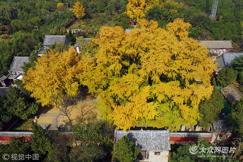 2017年10月31日,山東日照,航拍莒縣浮來山風(fēng)景區(qū)內(nèi)的“銀杏樹王”。