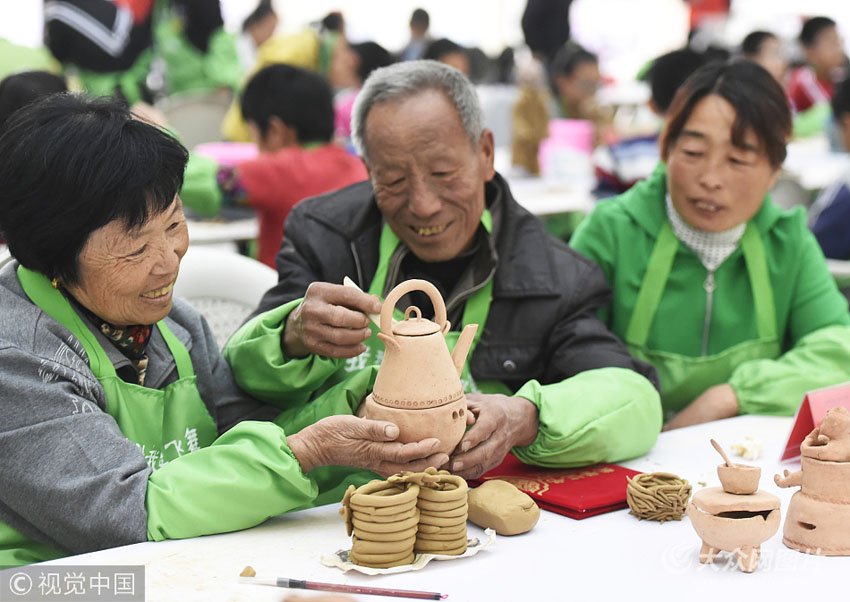 鄒平縣臨池鎮(zhèn)梁家村農民張方森(中)和妻子趙紅艷(左一)在陶藝比賽中創(chuàng)作《小時候的記憶》陶藝組件。