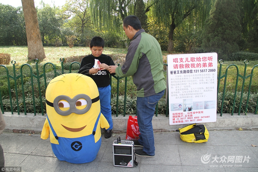 2017年10月31日,濟(jì)南趵突泉公園北門附近,半人高的“小黃人”玩偶里傳出孩子稚氣的歌聲,唱歌的是4個(gè)月前在山東省立醫(yī)院旁邊賣山藥救弟弟的9歲男孩新新(化名)。