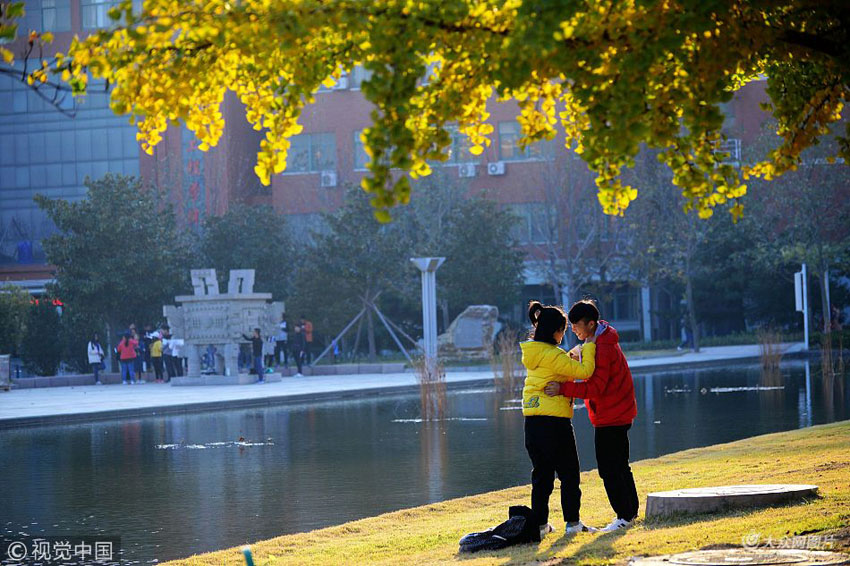 山東科技大學(xué),2位大學(xué)生在墨水河邊的銀杏樹下游玩。