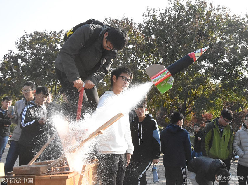 11月4日,聊城,第七屆“水火箭”DIY創(chuàng)新設(shè)計(jì)大賽在聊城大學(xué)舉辦,來自汽車與機(jī)械工程學(xué)院、化學(xué)化工學(xué)院等40支隊(duì)伍的170余名選手參加了比賽,比賽分為設(shè)計(jì)大比拼和飛行距離大比拼兩個(gè)部分,同學(xué)們利用生活中廢棄的飲料瓶制作模型,不僅廢物利用,而且綠色環(huán)保。各參賽隊(duì)伍為自己的“水火箭”注入一定量的水,將其放置在發(fā)射架上,并用打氣筒給水火箭加壓。據(jù)了解,水火箭是根據(jù)動(dòng)量守恒的反沖原理制作而成,比賽檢驗(yàn)了大學(xué)生對(duì)力學(xué)知識(shí)的掌握,還培養(yǎng)了大學(xué)生動(dòng)手動(dòng)腦的應(yīng)用能力。