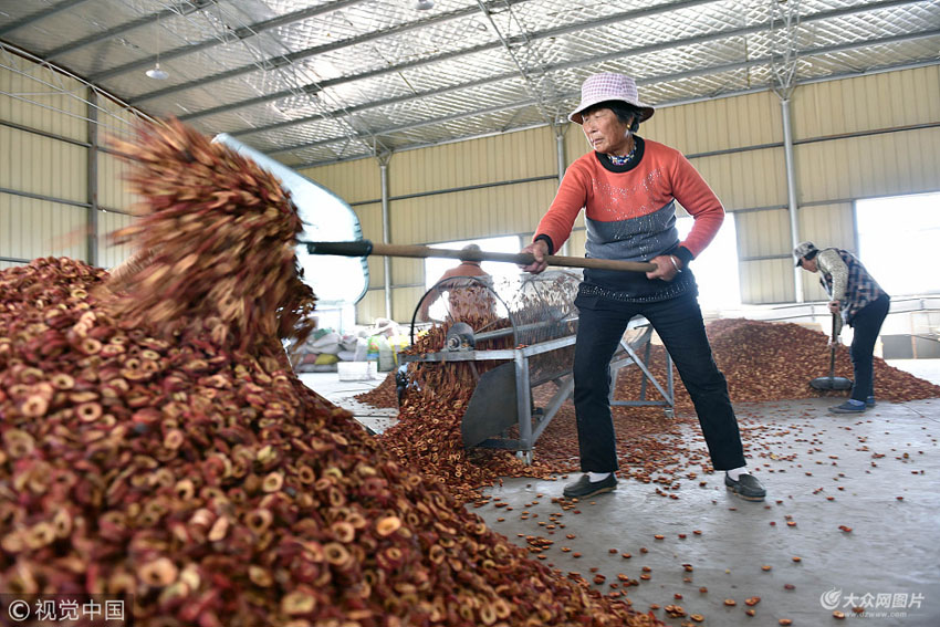 11月8日,在日照市莒縣寨里河鎮(zhèn)龍尾村的烘烤工場內(nèi),留守婦女們正在這里加工山楂干。近百名留守婦女在家門口的烘烤工場內(nèi)“淘金”,她們每天加工山楂3萬斤,干活利索的婦女一天能掙100多元,成為脫貧致富路上的一把好手!