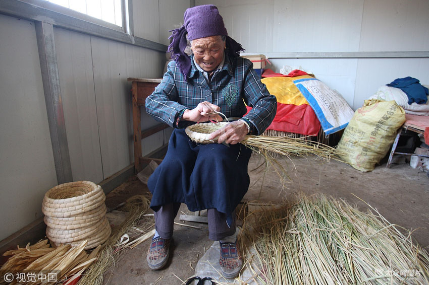 郯城縣花園鄉(xiāng)冷廟村村民,78歲的老人王恒英在為國外客商編織“鳥巢”。