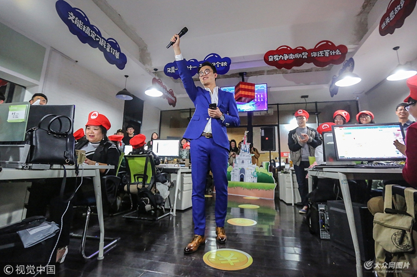 2017年11月10日晚,青島,今年“雙十一”他們將辦公室裝扮成“超級(jí)瑪麗”。