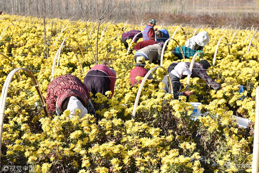 2017年11月11日,山東省日照市五蓮縣戶部鄉(xiāng)時(shí)家溝村,一名大媽正在采摘菊花。