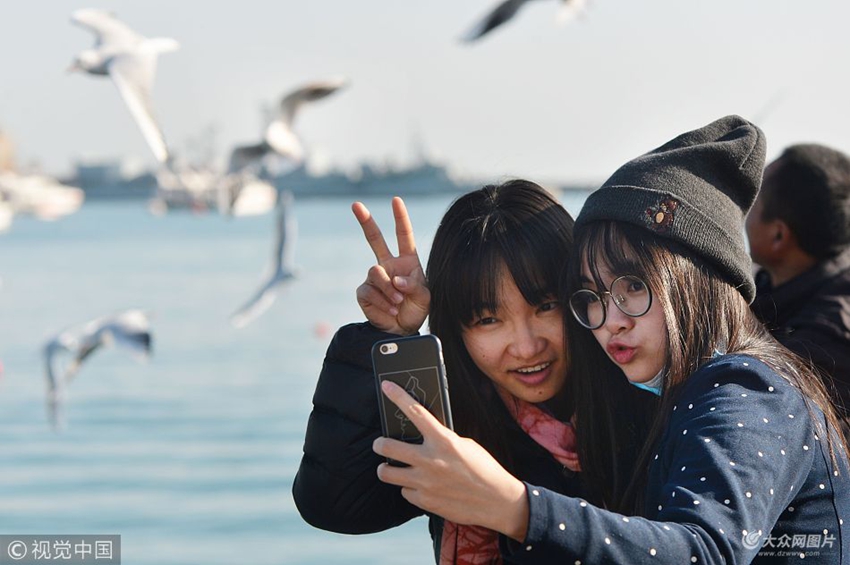 2017年11月14日,青島市棧橋景區(qū),游客以剛剛從西伯利亞遷徙歸來的紅嘴鷗為背景拍照。
