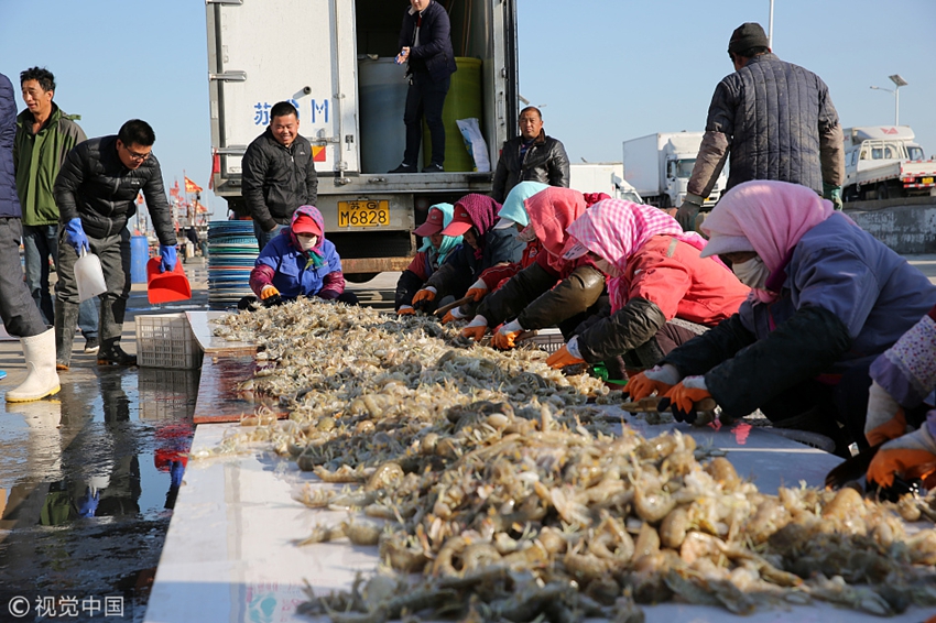 2017年11月15日下午,在山東東營市的黃河口中心漁港,出;貋淼臐O船剛一靠岸,水產(chǎn)批發(fā)商們就蜂擁而上。專業(yè)分揀海鮮的9位“漁嫂”每人手持小竹片一字排開,穩(wěn)坐在岸邊的“爬蝦山”前,非常嫻熟地開始了緊張的分揀工作。