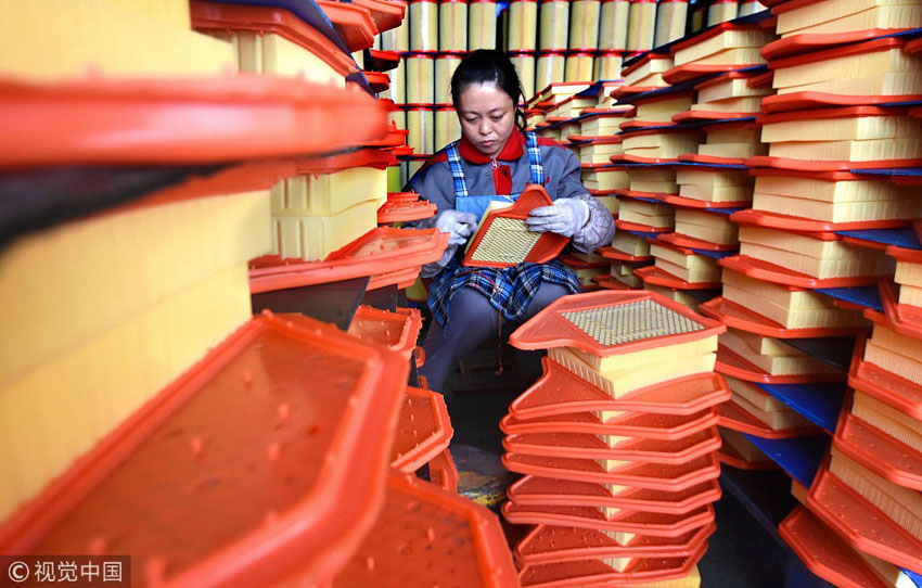 農(nóng)民在淄博市沂源縣歷山街道一濾清器企業(yè)車間對產(chǎn)品進行手工整理。