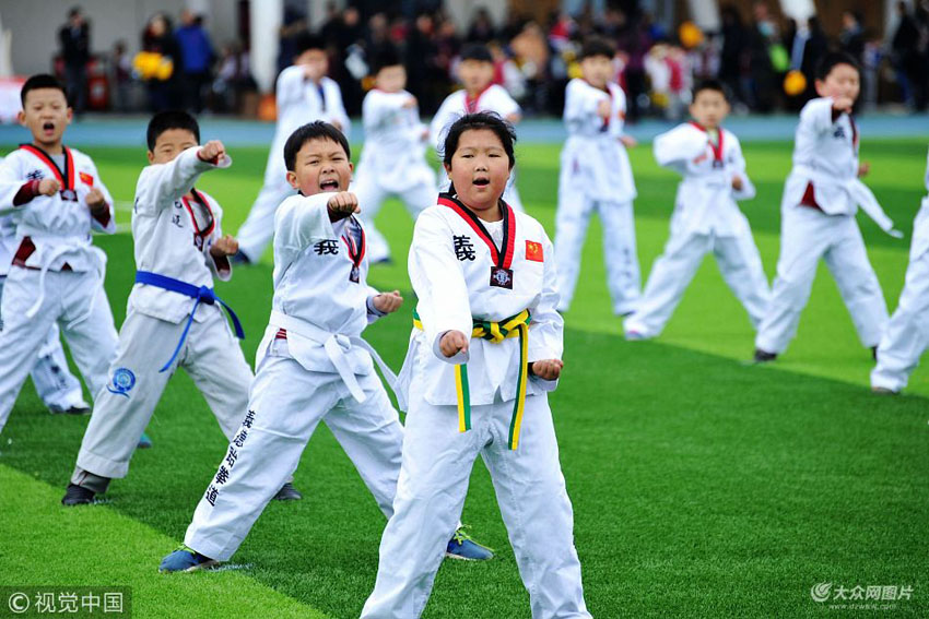 小學(xué)生們在表演“跆拳道”。